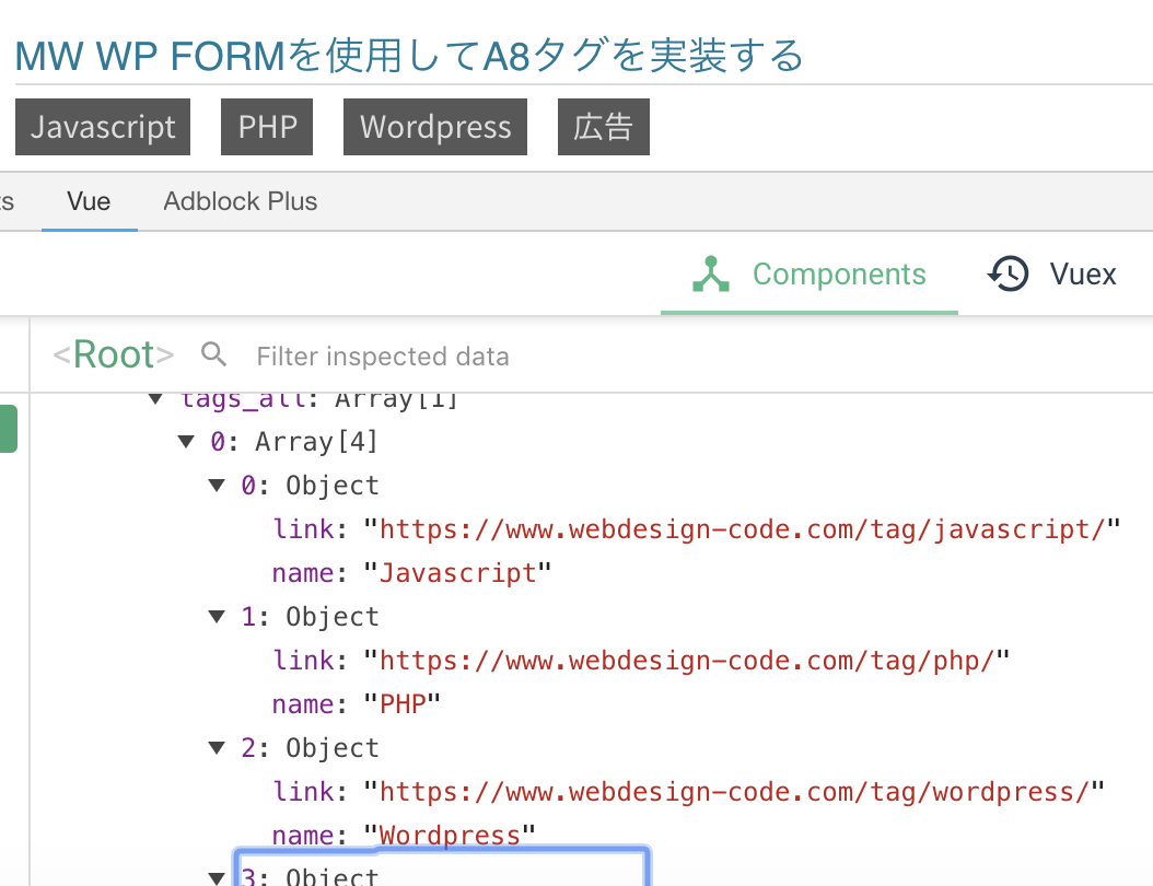 Vue.jsでWordpressのRest APIで情報を取得する際に、カテゴリーやタグはIDのみ取得されてる状態なので、タグ名やタグアーカイブへのリンクを自身で追加する必要がある。