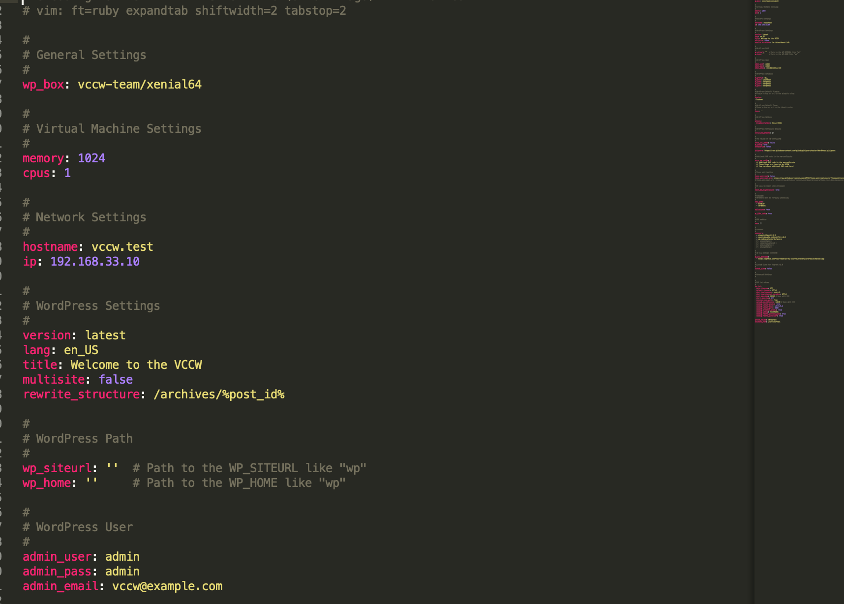 # # Network Settings # hostname: project.site #任意の名前を付けてください ip: 192.168.33.10 #既に使用しているipと被ると同時起動できないので注意です # # WordPress Settings # lang: ja #「ja」としてください # # WordPress User # admin_user: admin #ログインID admin_pass: admin #ログインパスワード admin_email: vccw@example.com